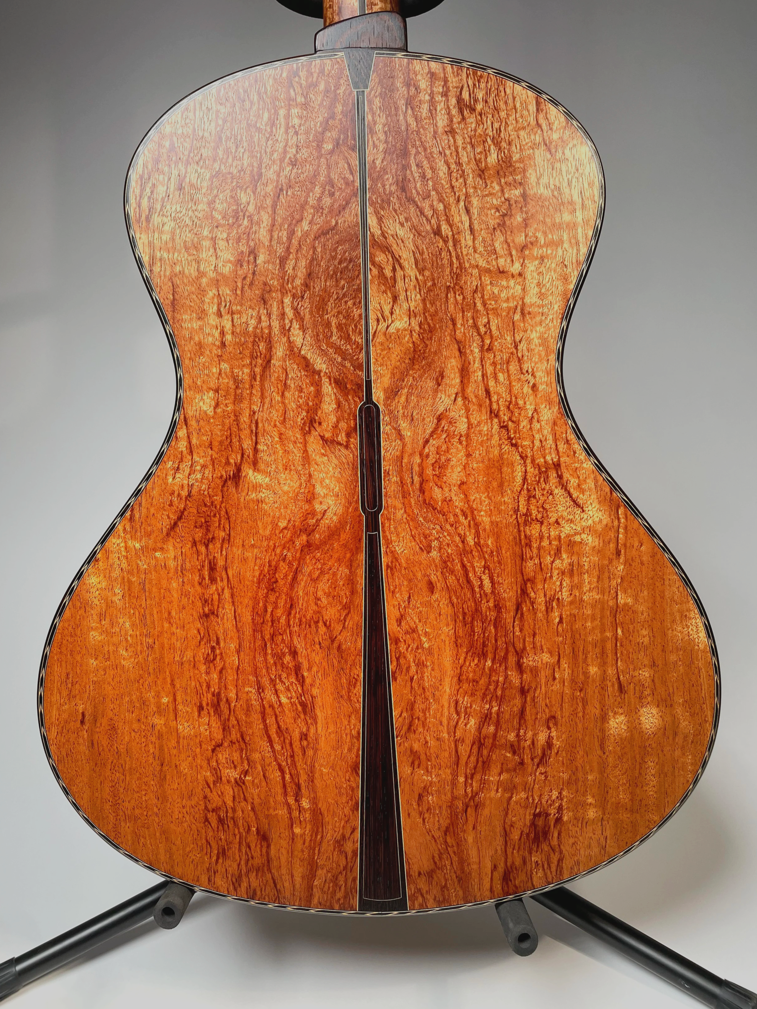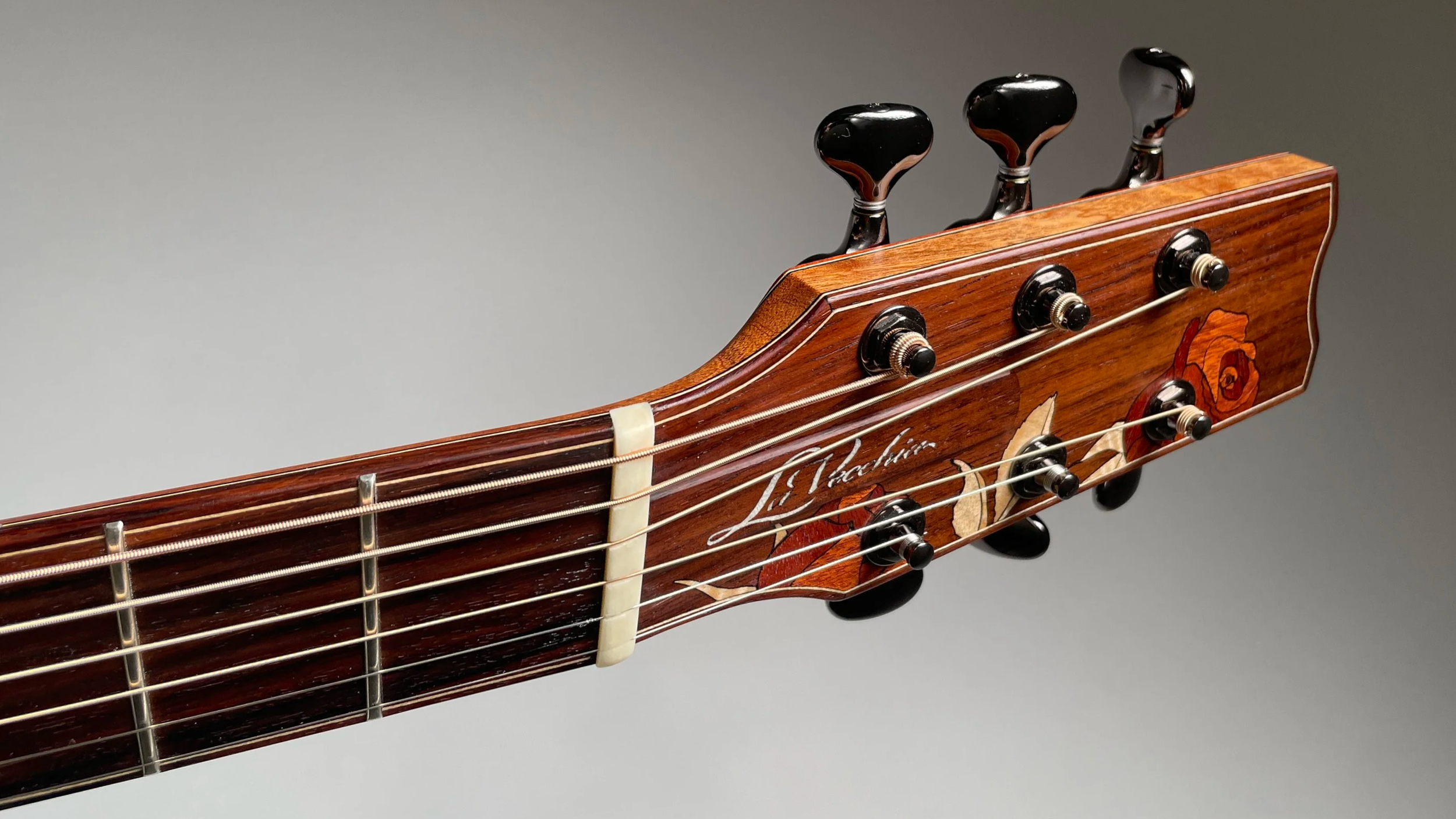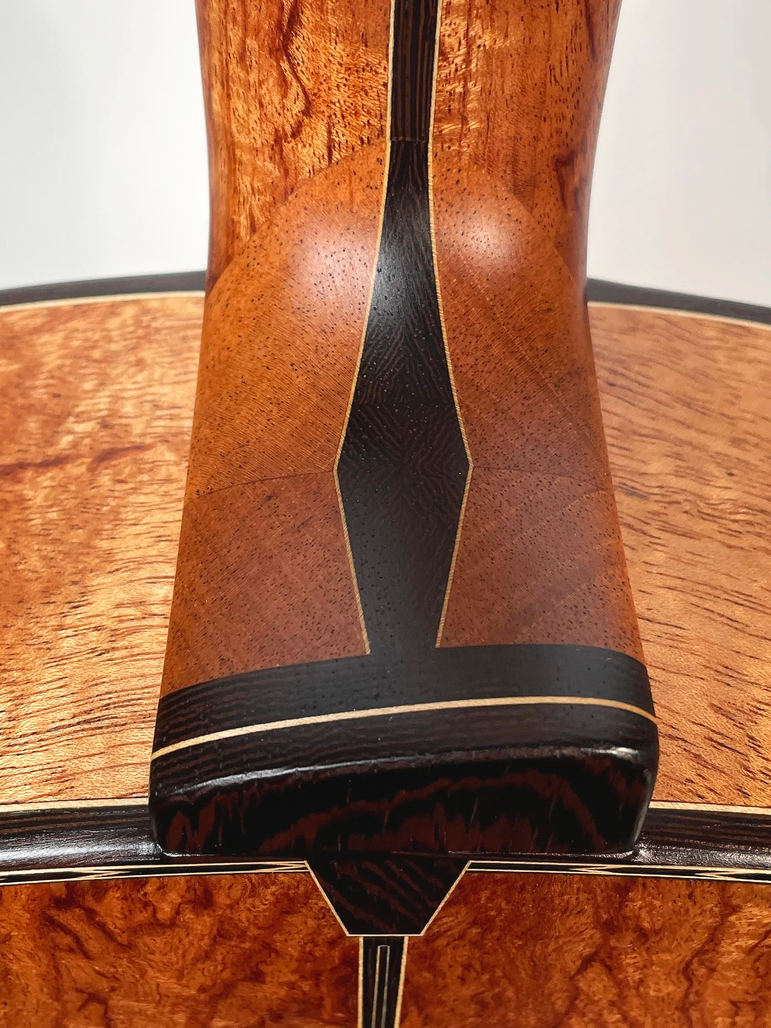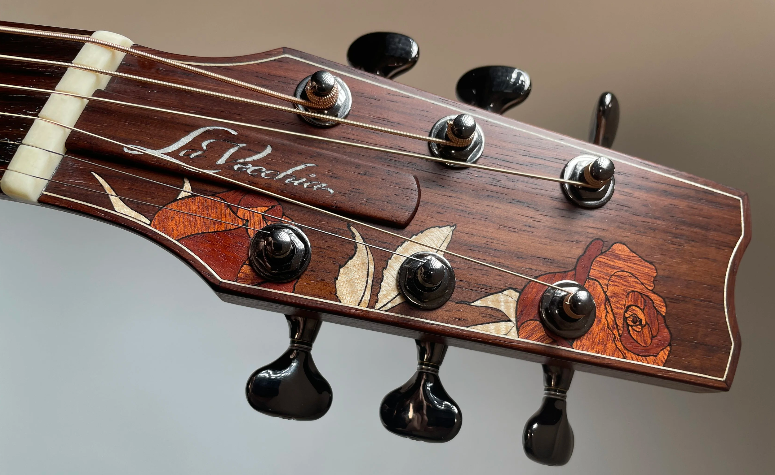 This rose themed inlay was executed upon customer request and designed in-house, each piece is hand assembled from individual sections of blood wood and curly maple, set in lovely Indian Rosewood. If you have a special idea for a personalized touch on your instrument, we can collaborate together to realize that idea in your build.
