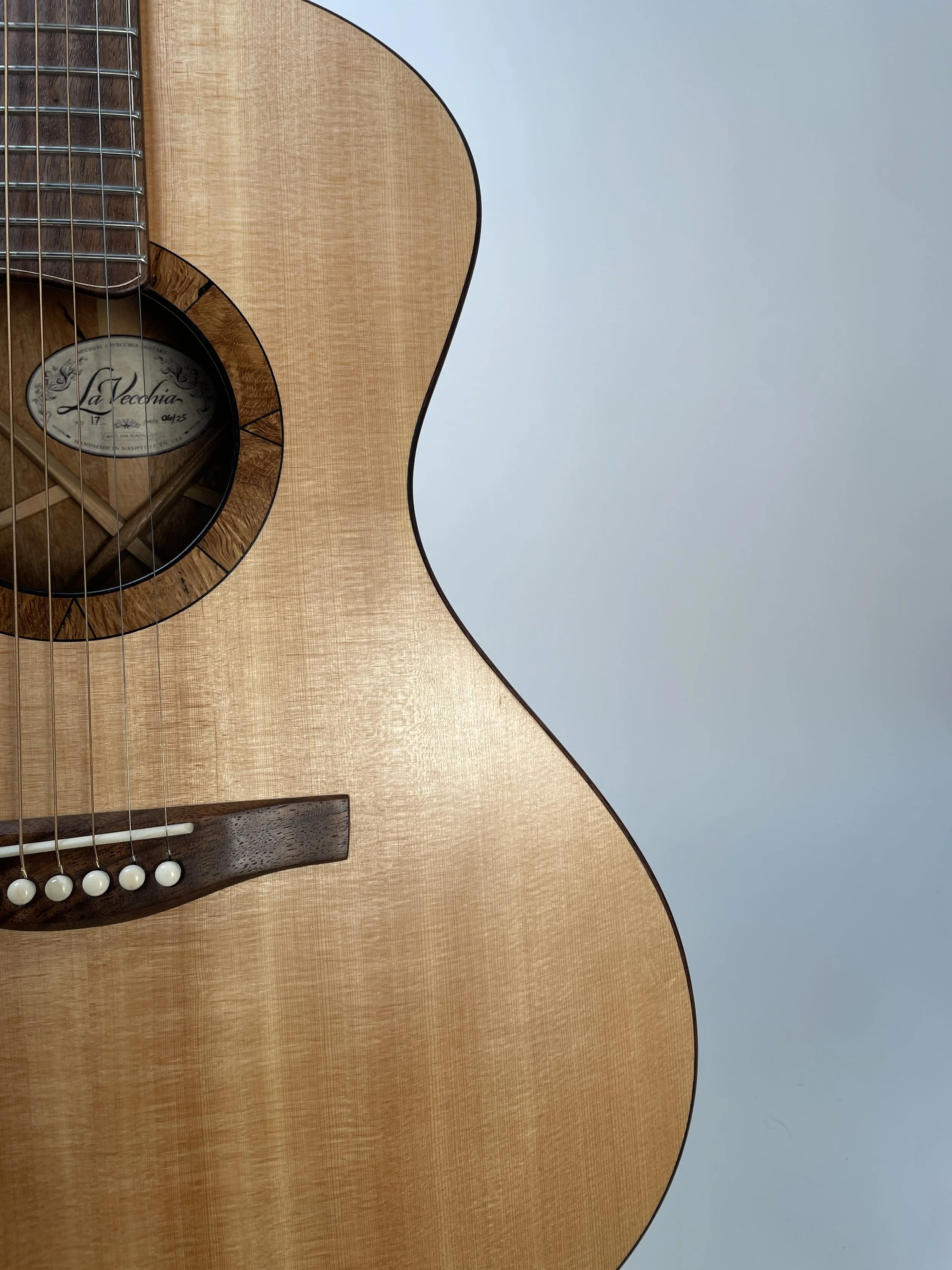 The TripleNaught is a unique and versatile instrument. It was conceived in an effort to blend some of my favorite attributes of the Triple 0 and Dreadnaught shapes we all know and love. The bodies flowing curvature and tight waist provide a profoundly intimate and comfortable experience. This comfort is achieved while still sporting a 16” lower bout providing a powerful, nuanced, and responsive tone.